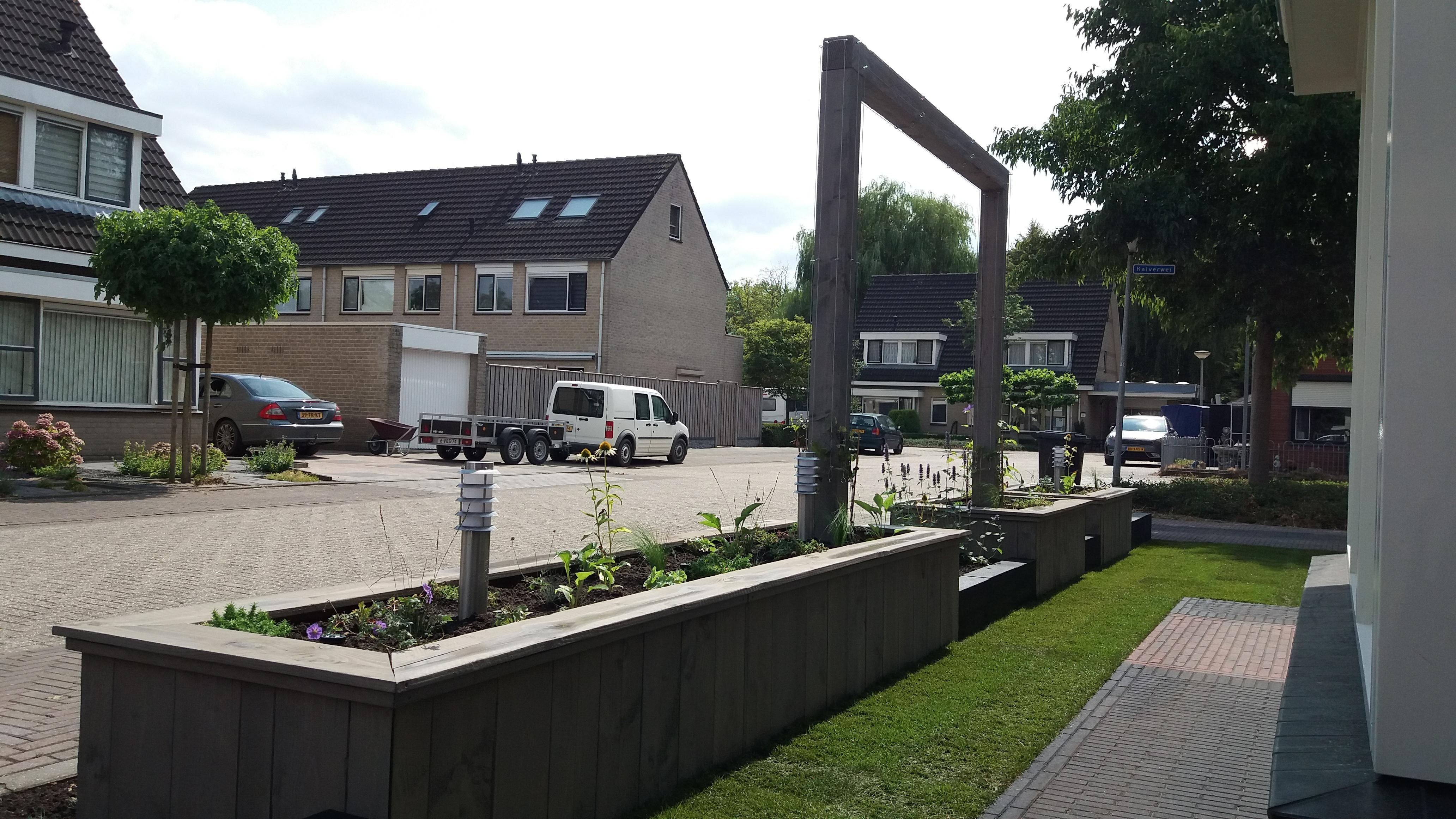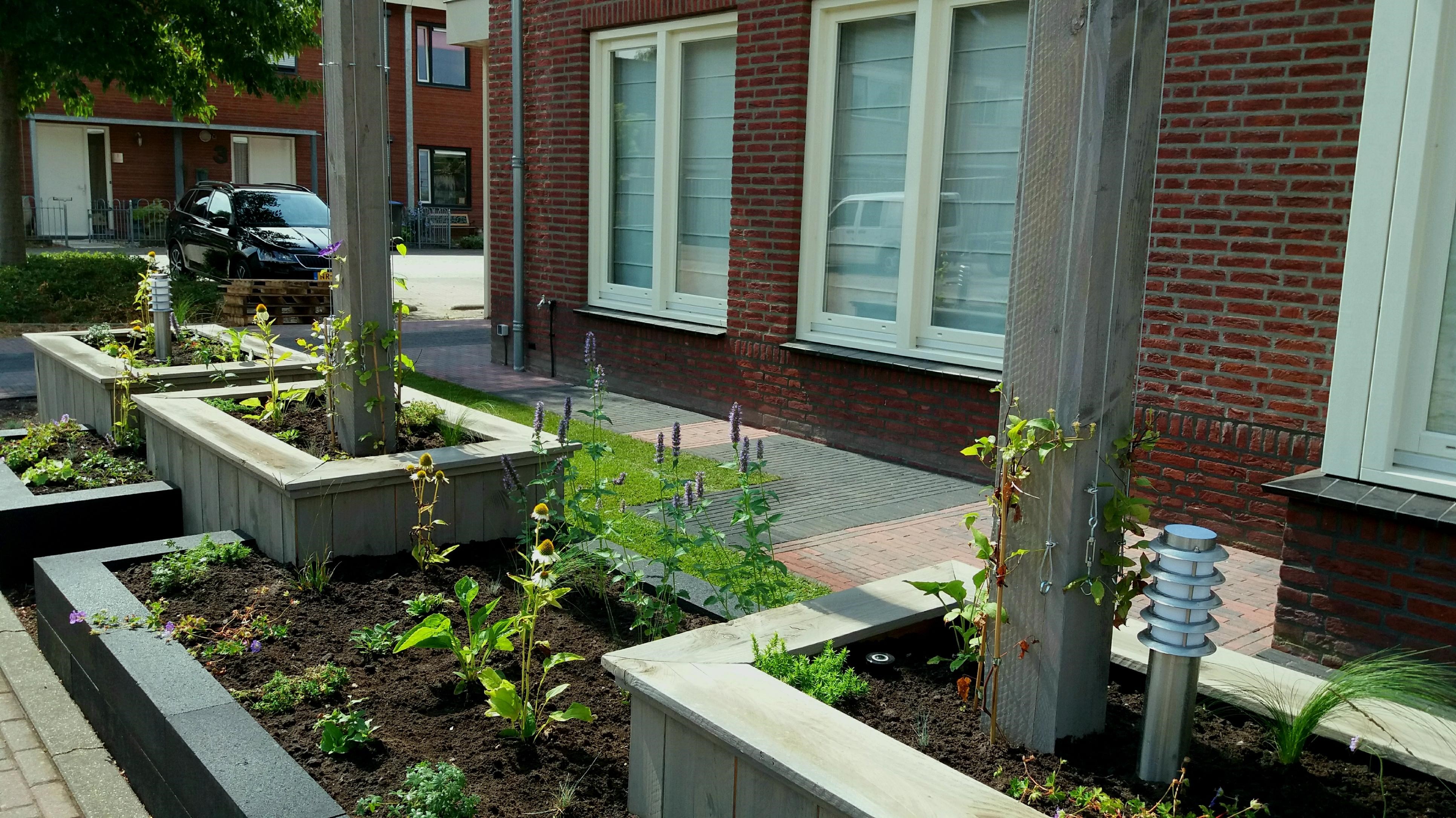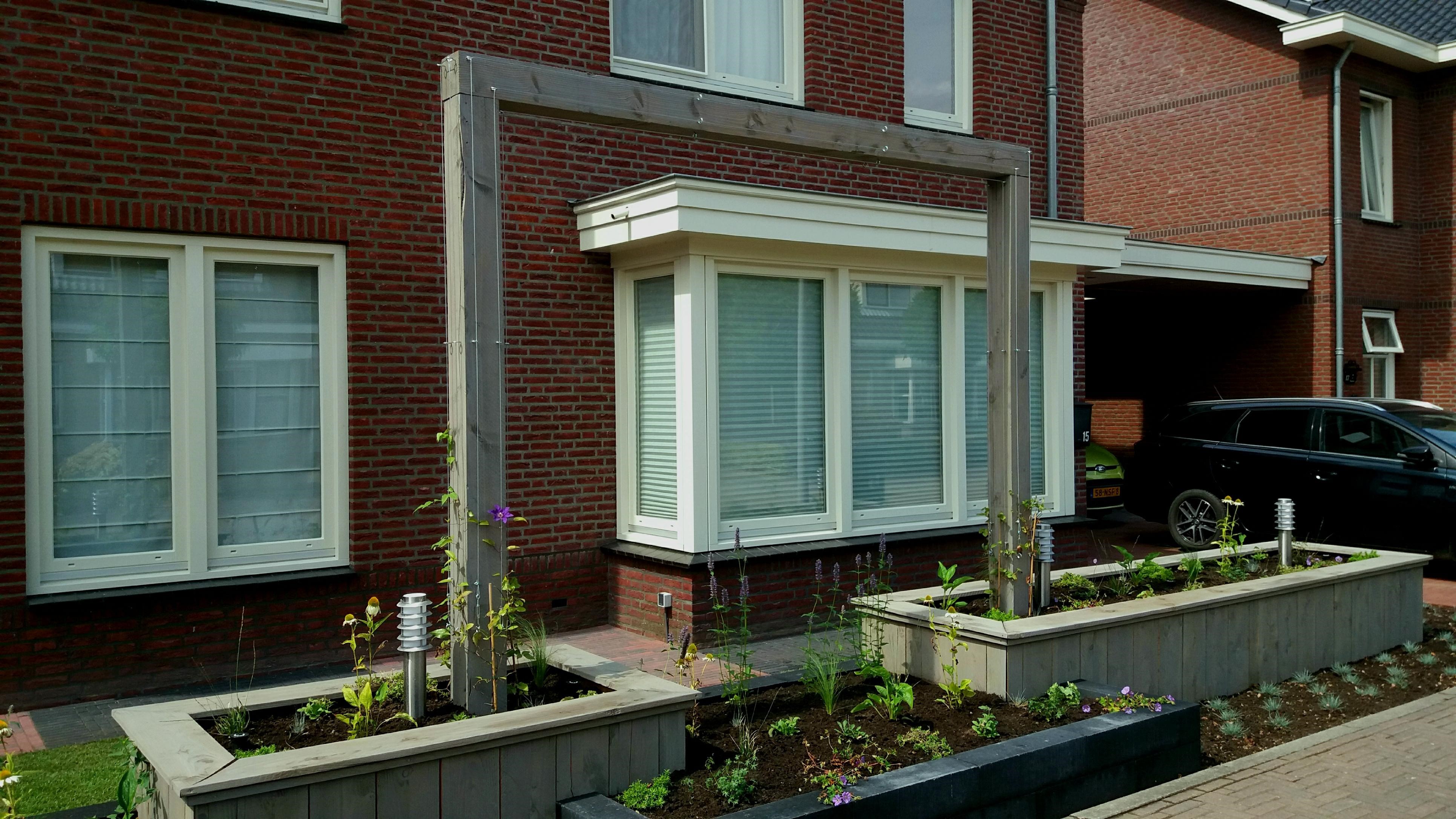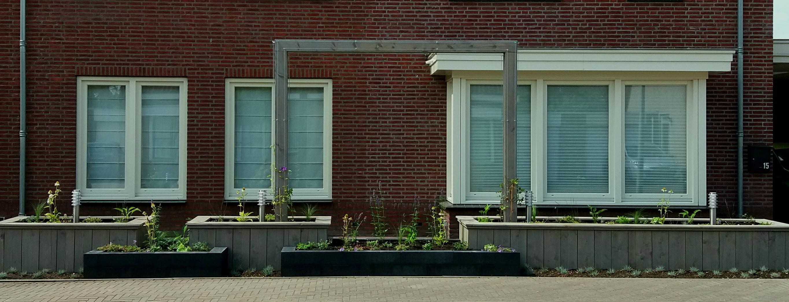 Twee voortuinen smelten samen tot één geheel. De uitstraling van deze statige twee-onder-een-kapper wordt versterkt door de belijning van de architectuur door te trekken in het ontwerp voor de tuin, de keuze voor materialen en kleuren worden hier eveneens op afgestemd. Het variëren met hoogteverschil in de borders, en de verbindende pergola geven een mooie dimensie aan deze brede maar ondiepe tuin. Sfeervolle onderhoudsarme beplanting met bloemen van maart tot december maken het geheel af.