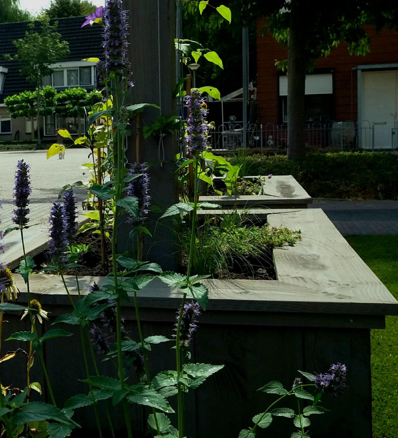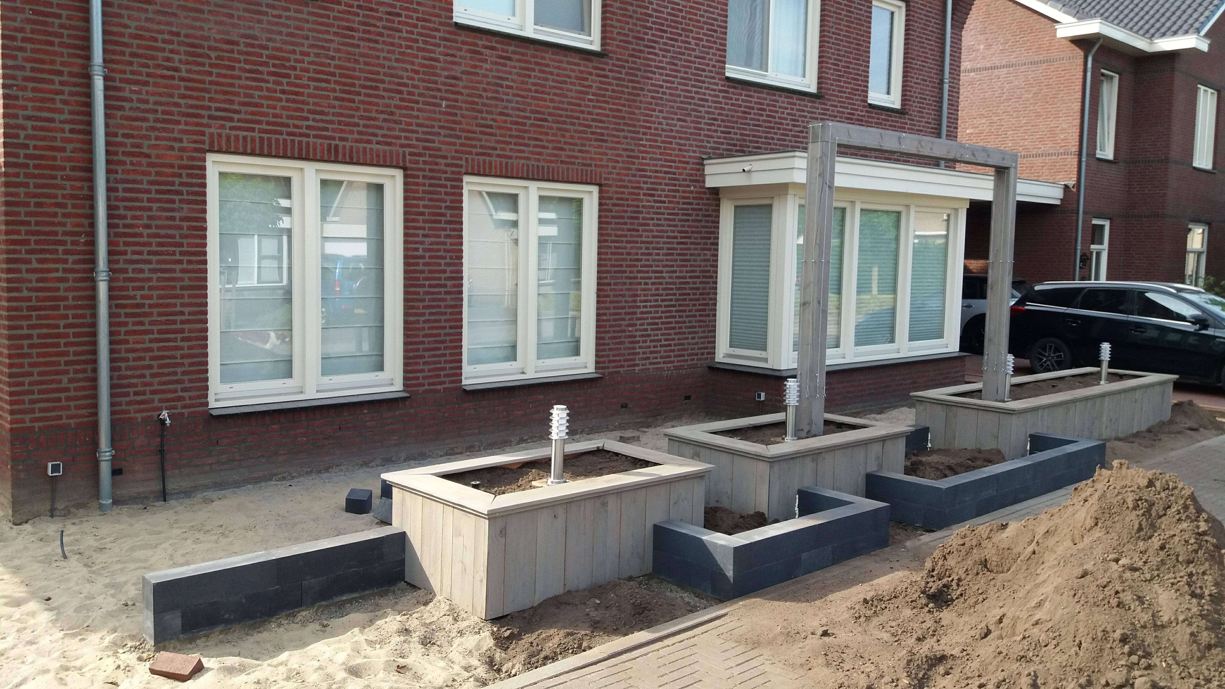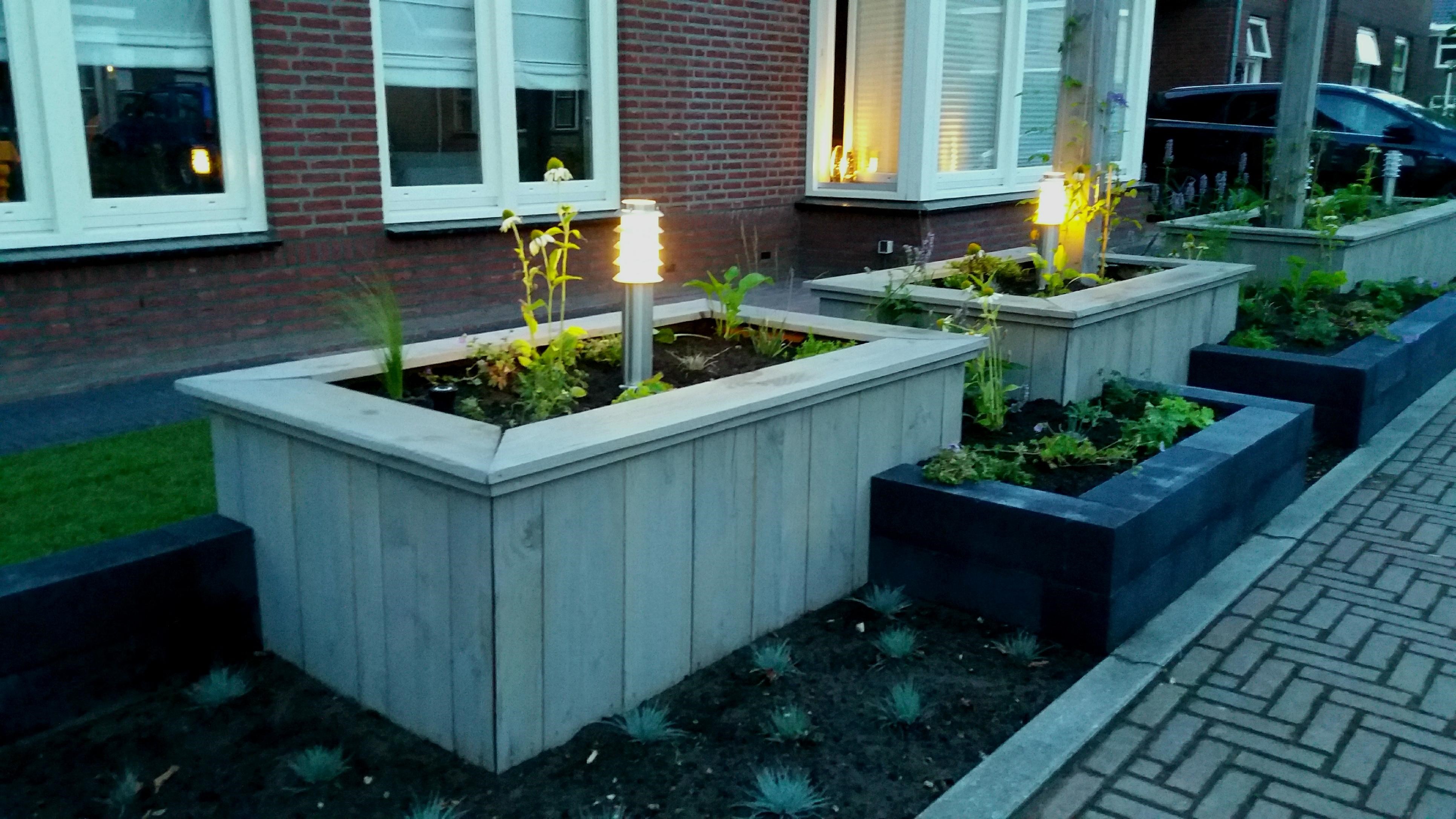Twee voortuinen smelten samen tot één geheel. De uitstraling van deze statige twee-onder-een-kapper wordt versterkt door de belijning van de architectuur door te trekken in het ontwerp voor de tuin, de keuze voor materialen en kleuren worden hier eveneens op afgestemd. Het variëren met hoogteverschil in de borders, en de verbindende pergola geven een mooie dimensie aan deze brede maar ondiepe tuin. Sfeervolle onderhoudsarme beplanting met bloemen van maart tot december maken het geheel af.