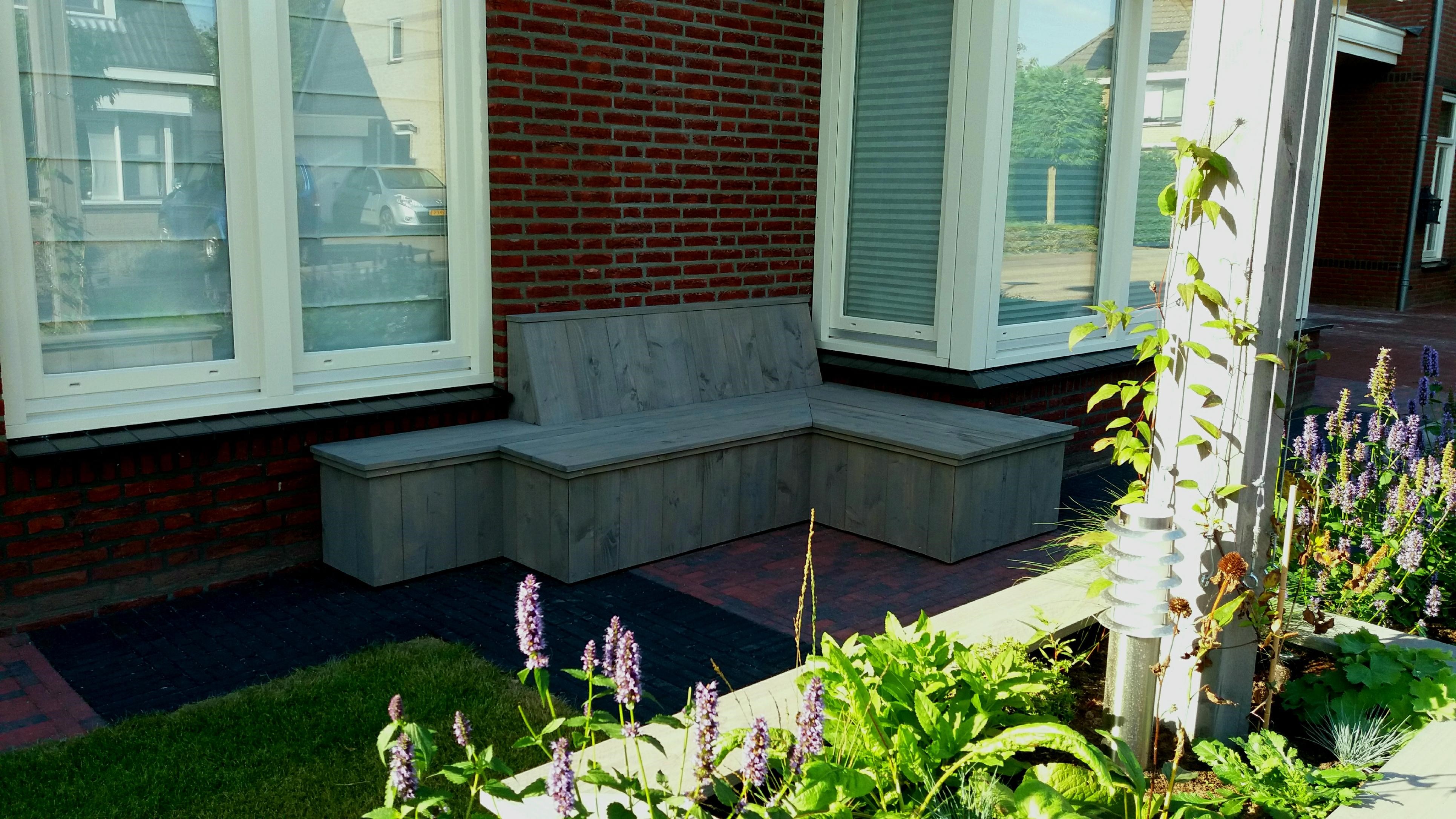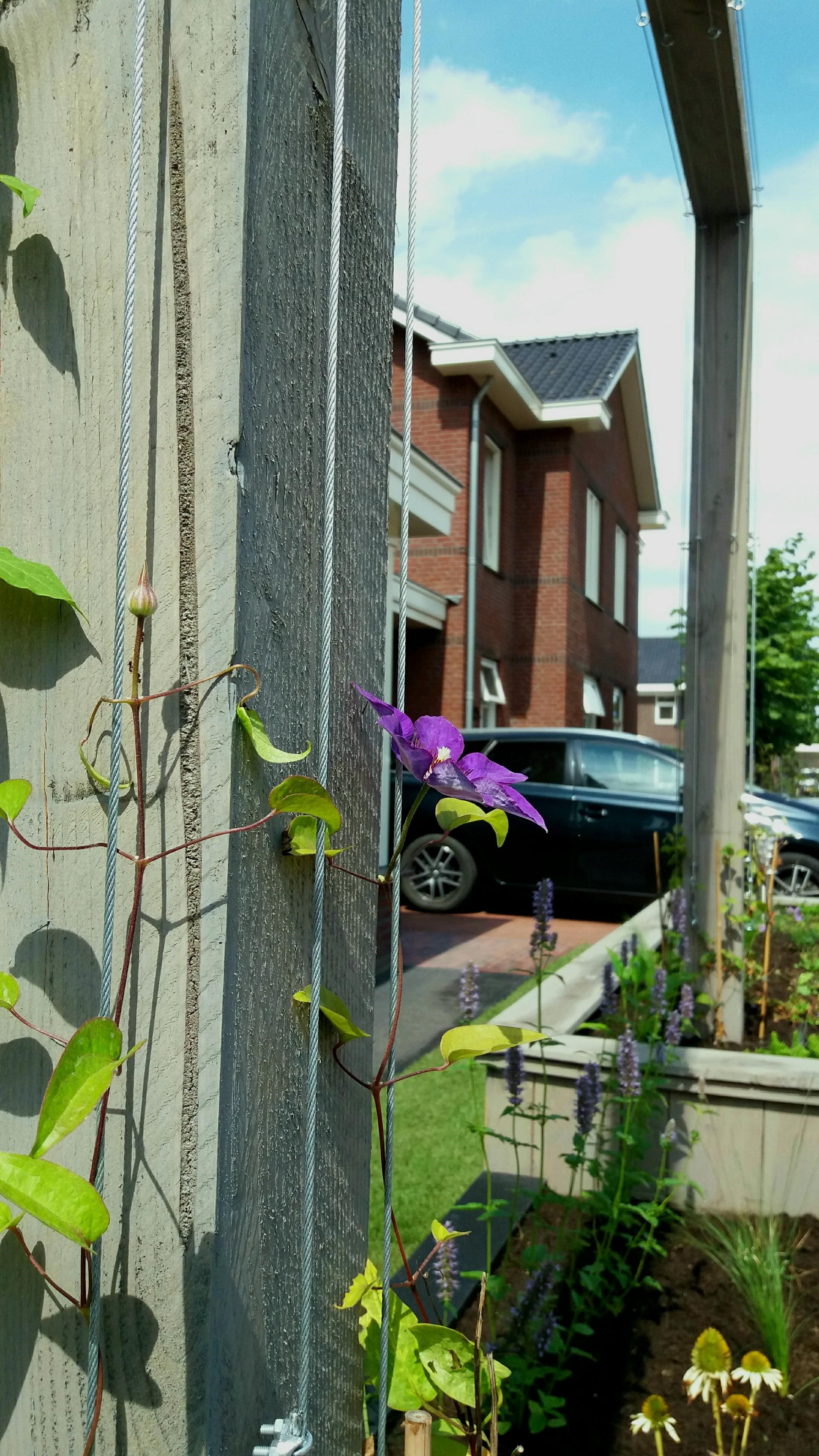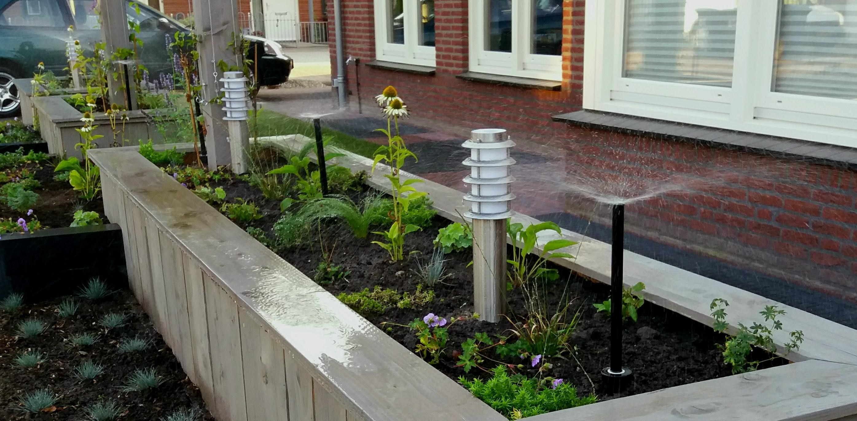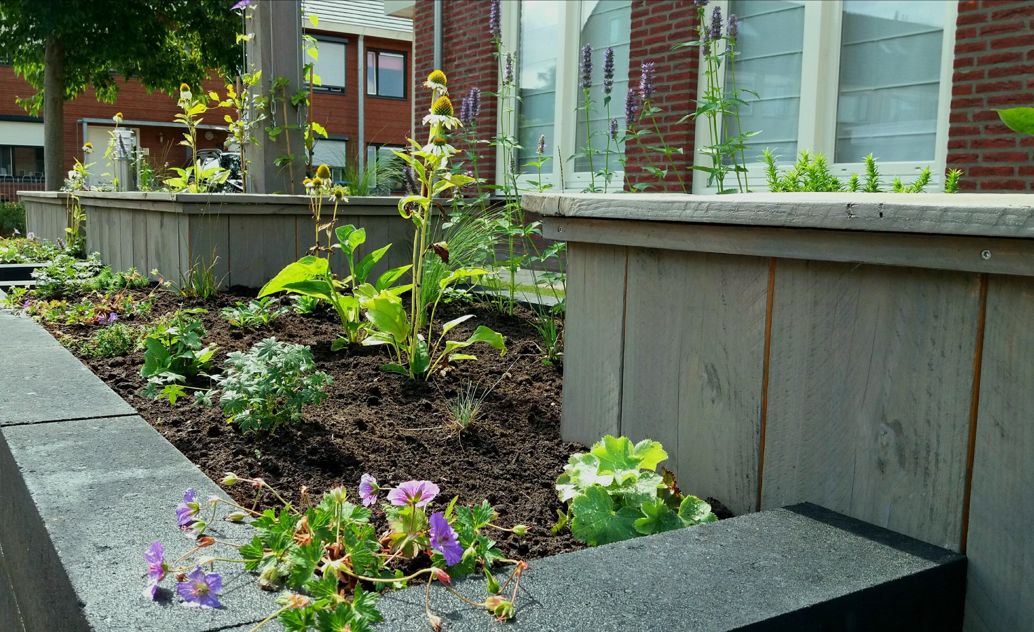 Twee voortuinen smelten samen tot één geheel. De uitstraling van deze statige twee-onder-een-kapper wordt versterkt door de belijning van de architectuur door te trekken in het ontwerp voor de tuin, de keuze voor materialen en kleuren worden hier eveneens op afgestemd. Het variëren met hoogteverschil in de borders, en de verbindende pergola geven een mooie dimensie aan deze brede maar ondiepe tuin. Sfeervolle onderhoudsarme beplanting met bloemen van maart tot december maken het geheel af.